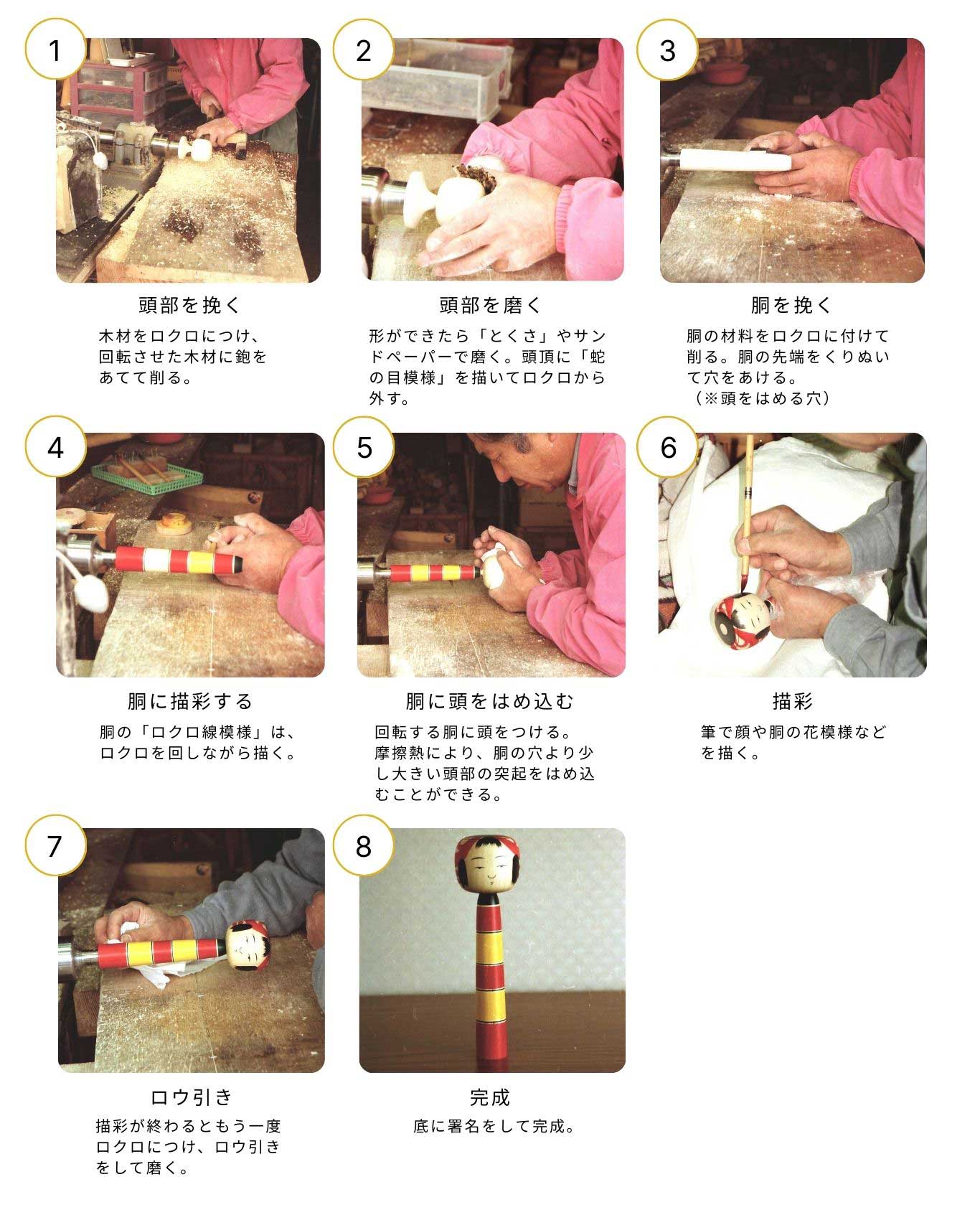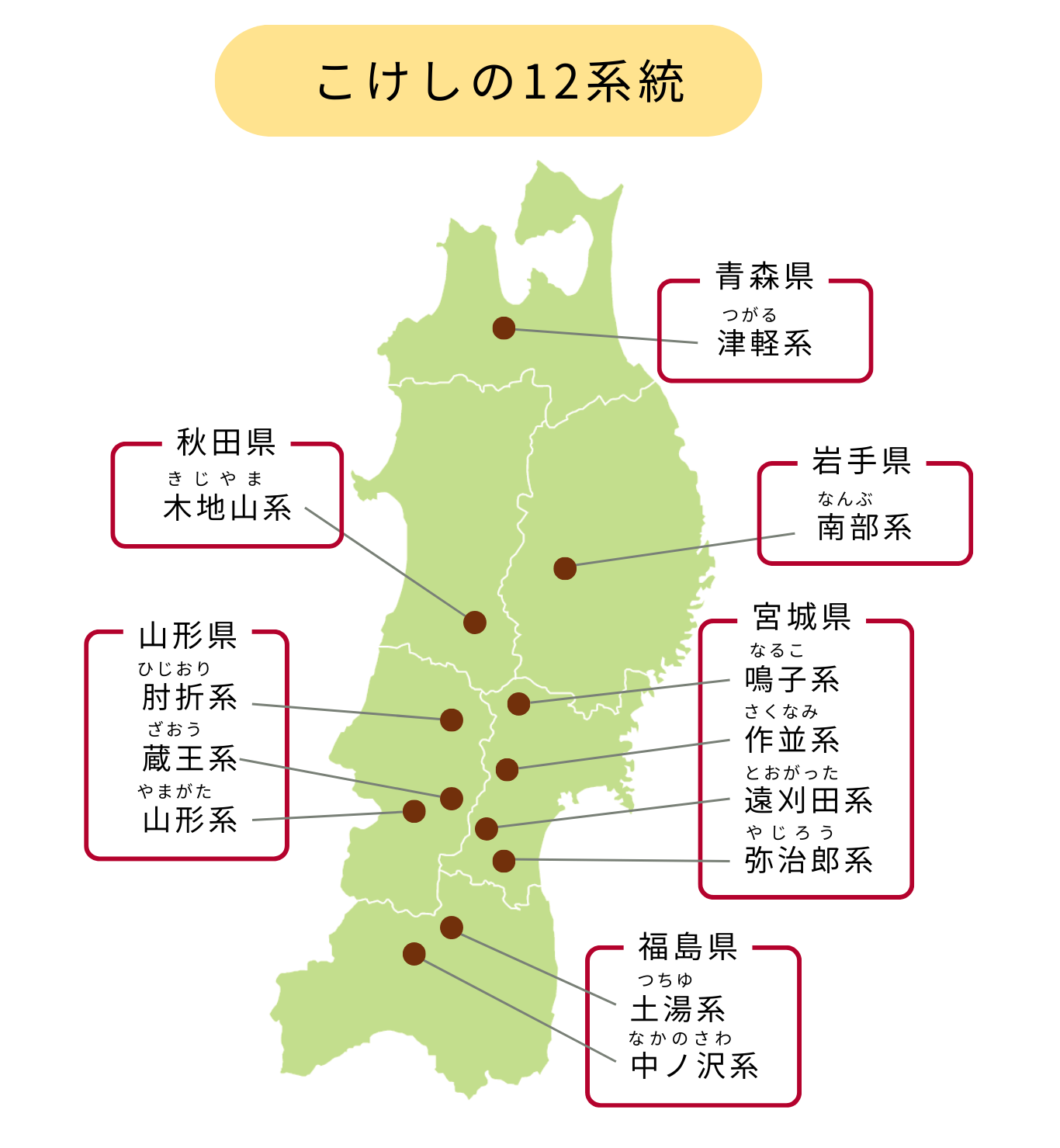 東北地方で誕生したこけしは土地特有の形や模様があり、その特徴は12系統に分けることができます。このようなこけしは戦後新たにデザインされた「新型こけし」や「創作こけし」とは区別して「伝統こけし」と呼ばれ、親から子、師匠から弟子へと受け継がれています。