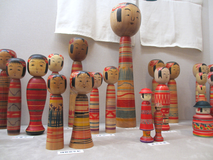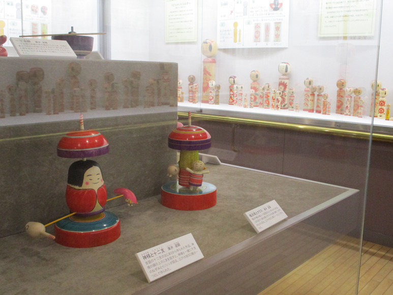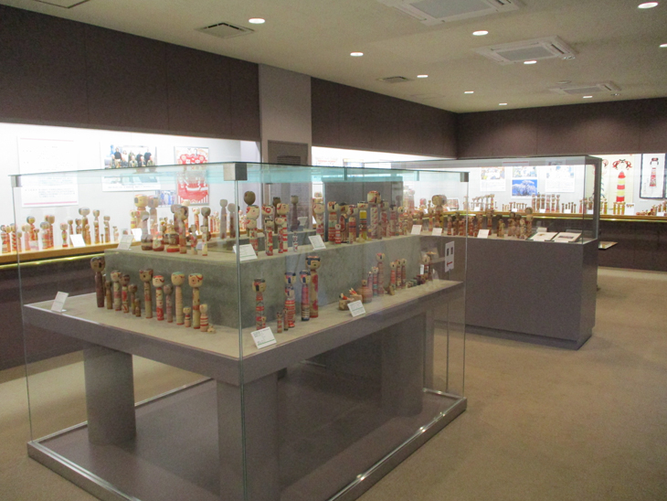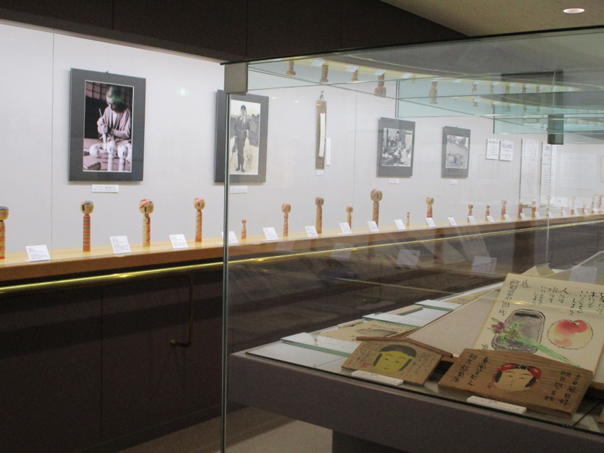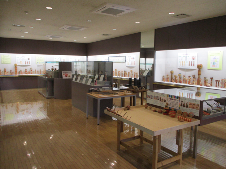 伝統こけしの概要を紹介しています。こけしは系統別に展示しており、それぞれ描彩、形、構造の特徴を12系統に分けて紹介しています。また、こけしの歴史や作り方、材料、木地玩具なども紹介しており、実際に木地玩具で遊ぶこともできます。