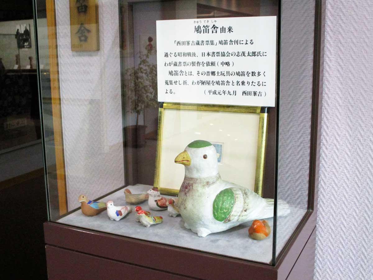 西田峯吉は、郷土玩具の鳩笛が好きで自身の部屋を「鳩笛舎」と名付けていました。これにちなみ、西田氏を紹介する展示室を鳩笛舎としております。